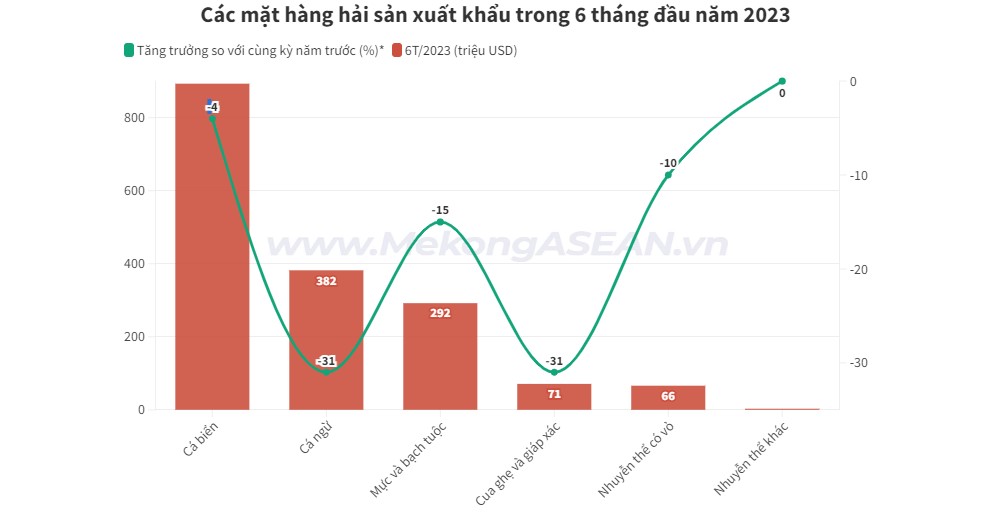 Theo Hiệp hội Chế biến và Xuất khẩu Thủy sản Việt Nam (VASEP), 6 tháng đầu năm 2023, xuất khẩu hải sản của Việt Nam đạt 1,7 tỷ USD, giảm 15% so với cùng kỳ năm 2022.